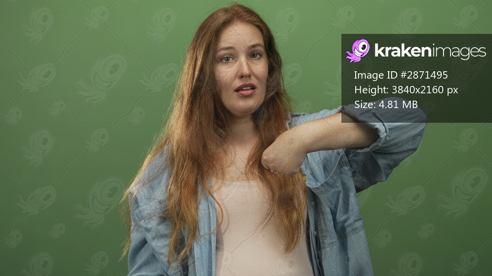 Young caucasian woman in denim shirt points finger to wrist under green studio lighting to signal she is late; urgency.