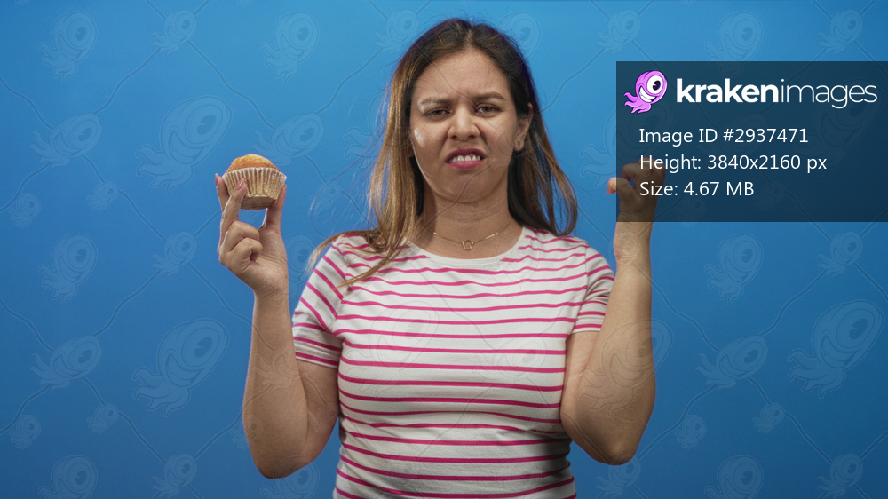 Young caucasian woman in pink striped shirt holding muffin with hand on head and grimacing in blue studio; disgust reluctance.