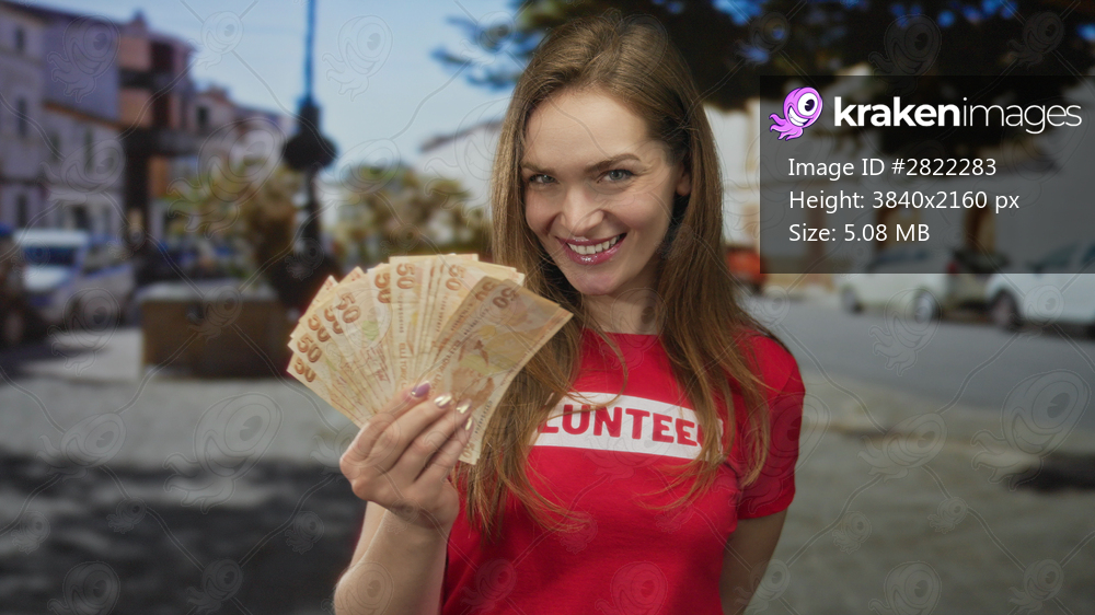 Young caucasian woman in red volunteer shirt hand holding banknotes on city street; charity support generosity.