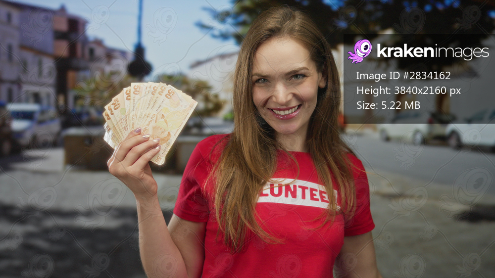 Young caucasian woman in red volunteer shirt hand holding banknotes on city street; charity support generosity.