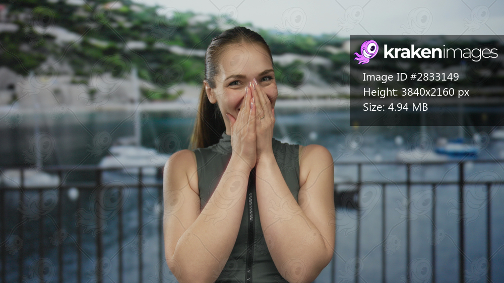 Young caucasian woman in sleeveless top smiling claps bare hands at port walkway with boats in view; joy.
