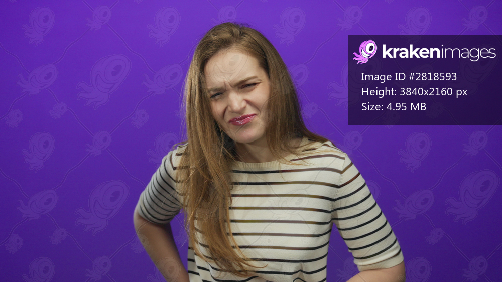 Young caucasian woman in striped top clutching abdomen and leaning forward with pained expression in purple studio; discomfort.