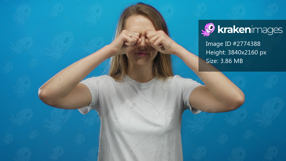 Young caucasian woman in white shirt rubbing eyes with surprise against isolated blue background wall.