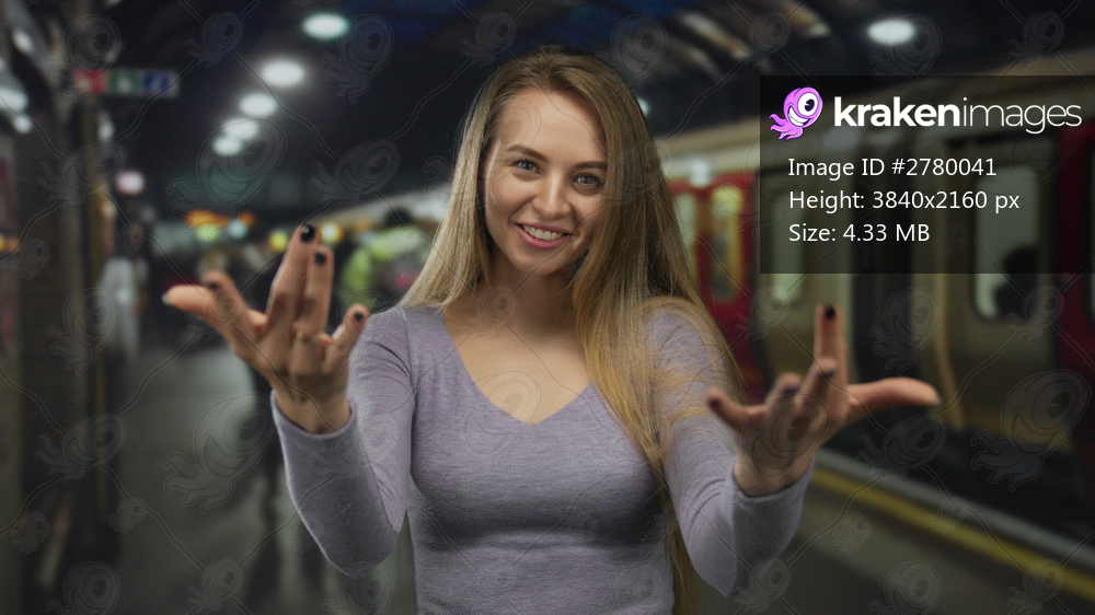 Young caucasian woman inviting with hand gesture at indoor train station with blurred railway background