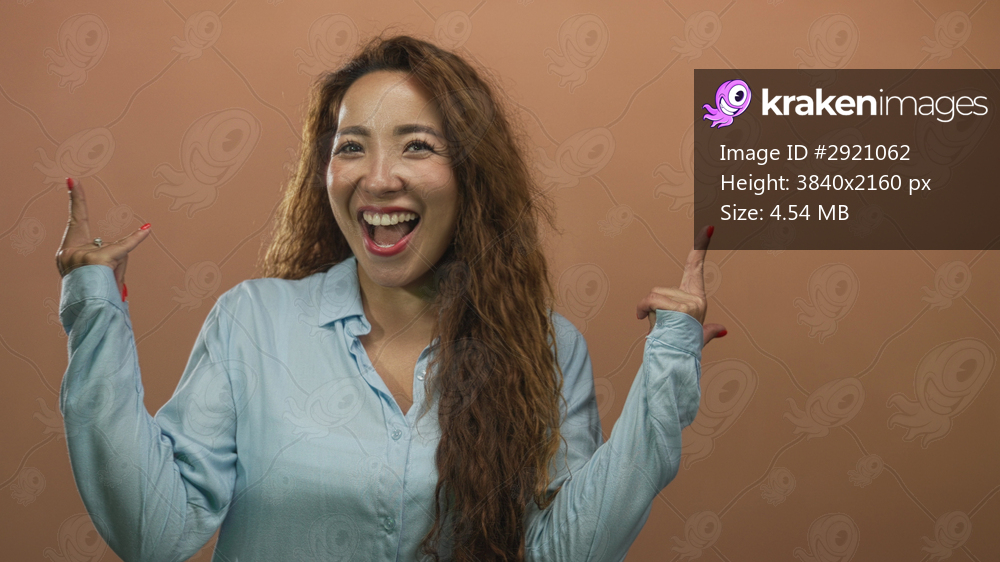 Young caucasian woman laughing with crossed arms and pointing fingers in peach studio wearing blue shirt; joy playful energy.