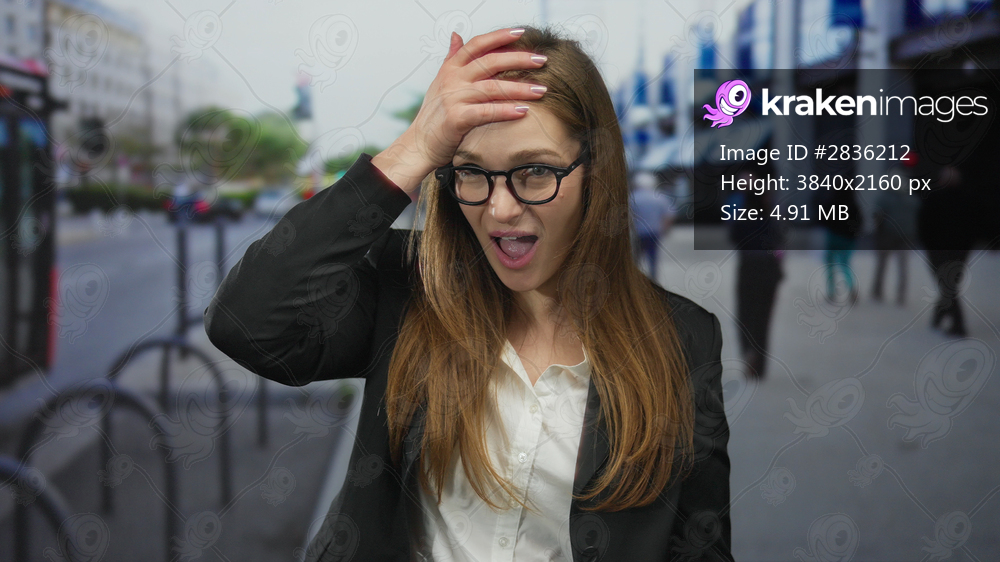 Young caucasian woman with long brown hair and glasses wearing black blazer holds hand to forehead on city street; surprise.