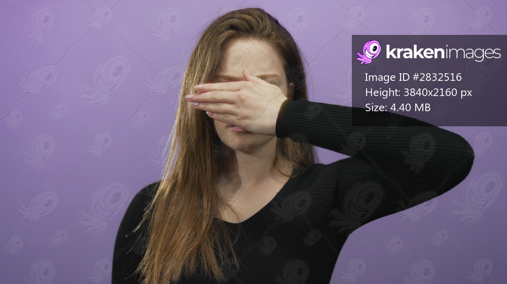Young caucasian woman with long brown hair pinches nose and tightly closes eyes in purple studio; disgust.