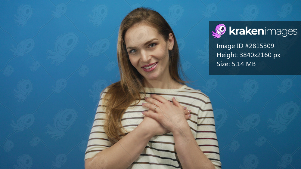 Young caucasian woman with long brown hair smiling and clasping hands to chest in studio; gratitude.
