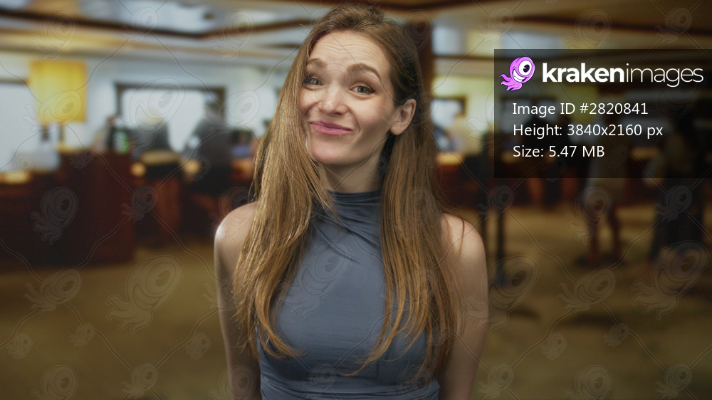 Young caucasian woman makes money gesture by pinching fingertips in hotel building lobby with a skeptical smile; greed.