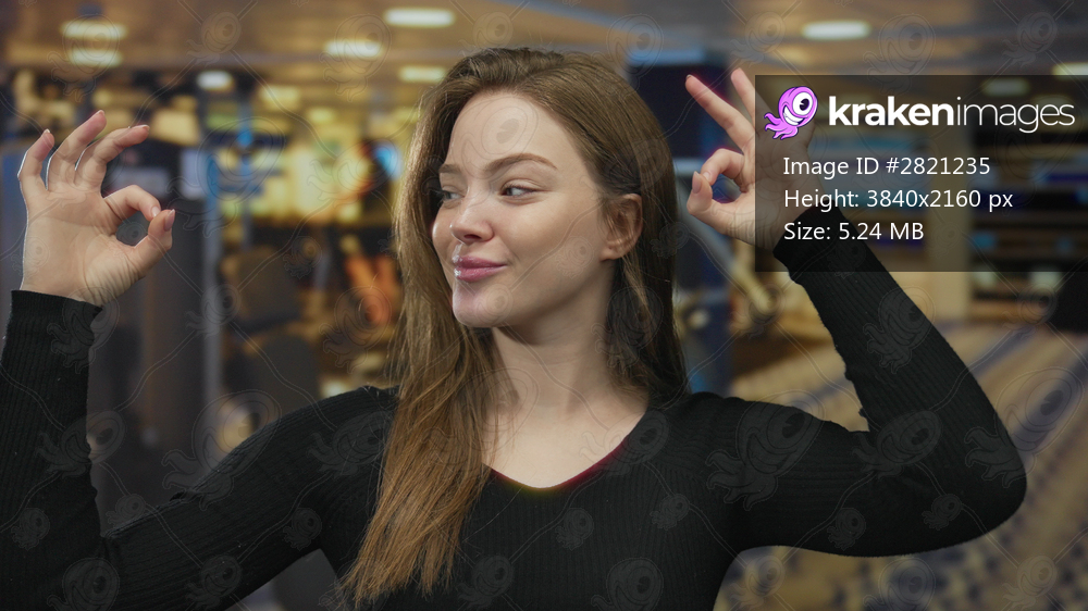 Young caucasian woman makes ok sign with both hands in a gym building surrounded by blurred workout machines; approval confidence.