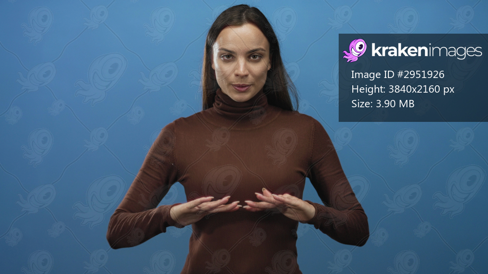 Young caucasian woman making expressive hand gestures near chest in studio against solid blue backdrop; serenity reflection.