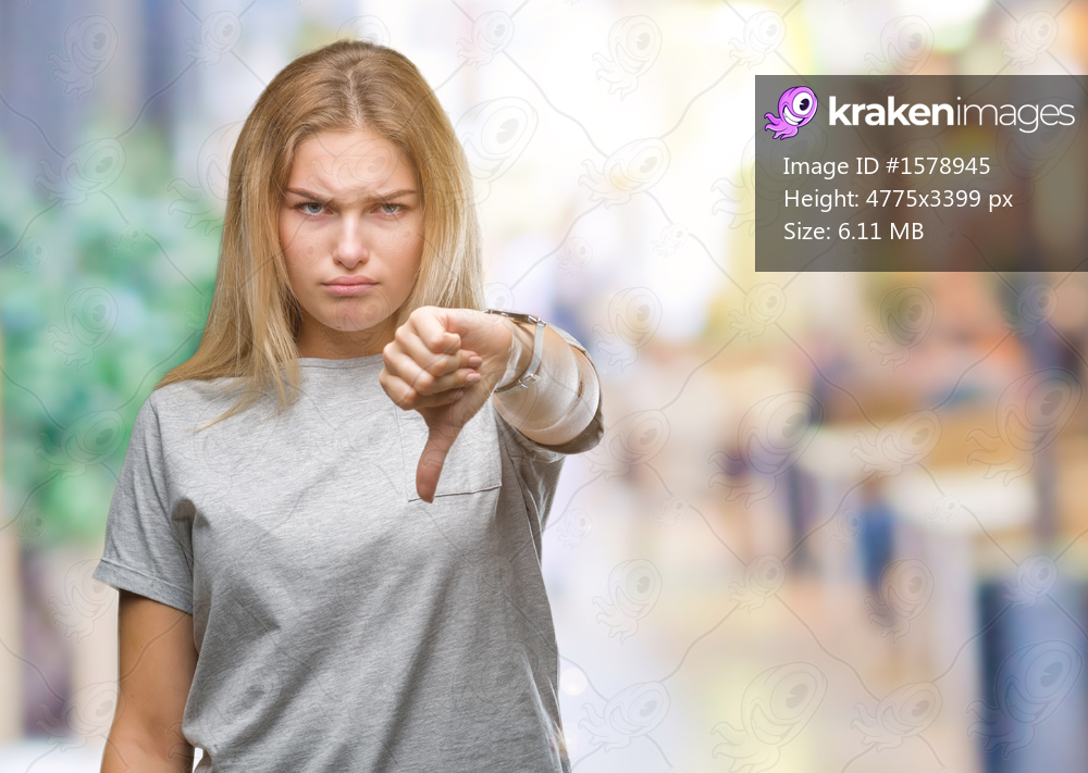 Young caucasian woman over isolated background looking unhappy and angry showing rejection and negative with thumbs down gesture. Bad expression.