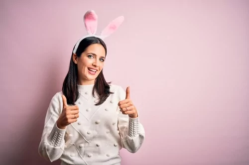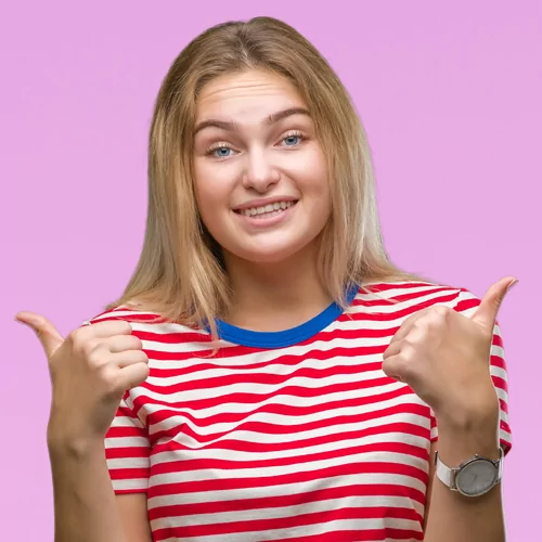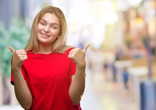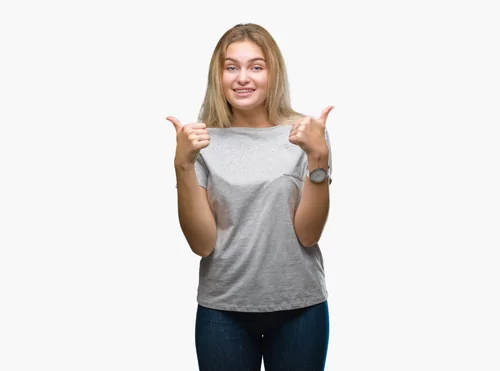 Young caucasian woman over isolated background success sign doing positive gesture with hand, thumbs up smiling and happy. Looking at the camera with cheerful expression, winner gesture. - Kraken Images