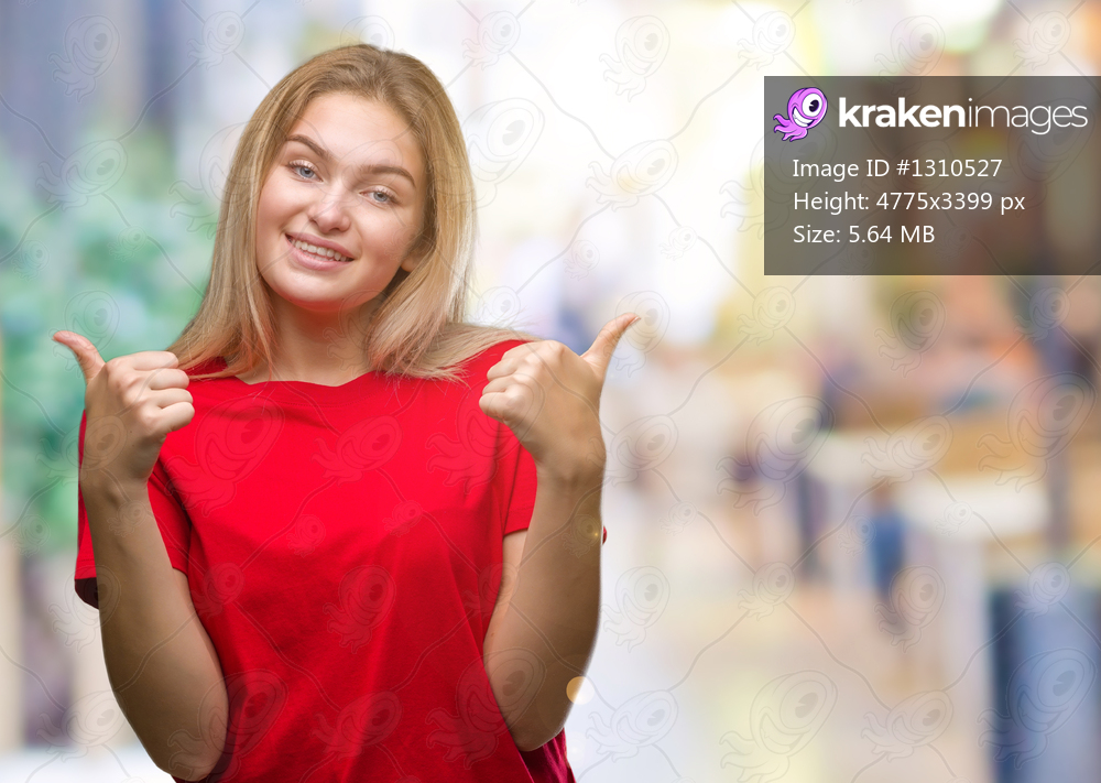 Young caucasian woman over isolated background success sign doing positive gesture with hand, thumbs up smiling and happy. Looking at the camera with cheerful expression, winner gesture. - Kraken Images