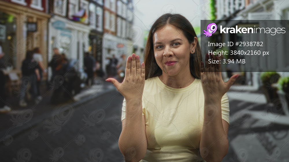Young caucasian woman pointing both index fingers at camera on busy city street, smiling with eyes closed and wearing yellow t shirt; confidence.