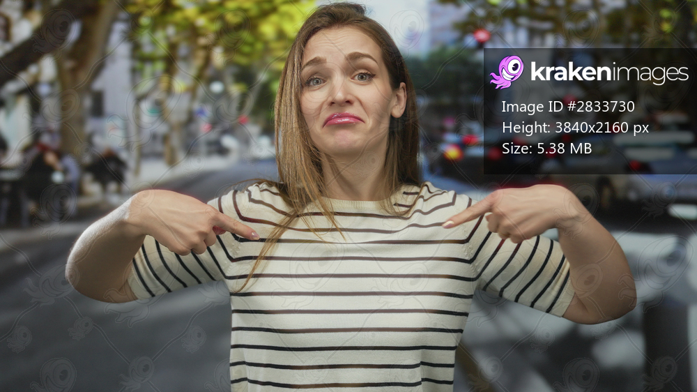 Young caucasian woman pointing finger at striped shirt on busy city street with blurred traffic in the background; surprise.