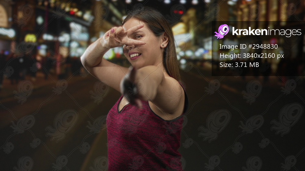 Young caucasian woman pointing finger with bare hand toward camera on a busy city street at night; confident playfulness.