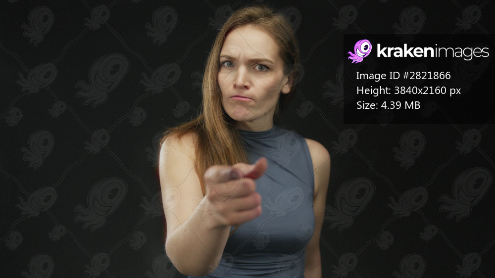 Young caucasian woman pointing finger with frown and direct eye contact in black studio; confrontation anger.