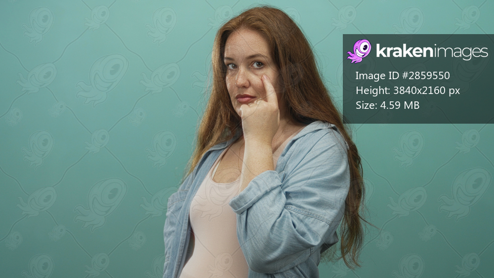 Young caucasian woman pointing finger to eye with direct gaze in teal studio; alertness observation.