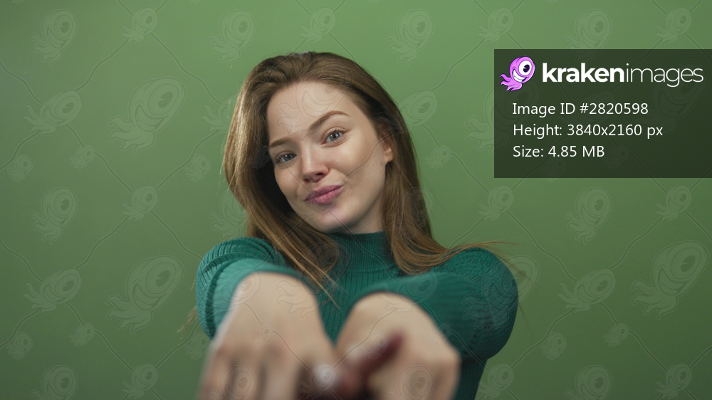 Young caucasian woman pointing finger toward camera in a professional studio setting with confident posture; playfulness joy.