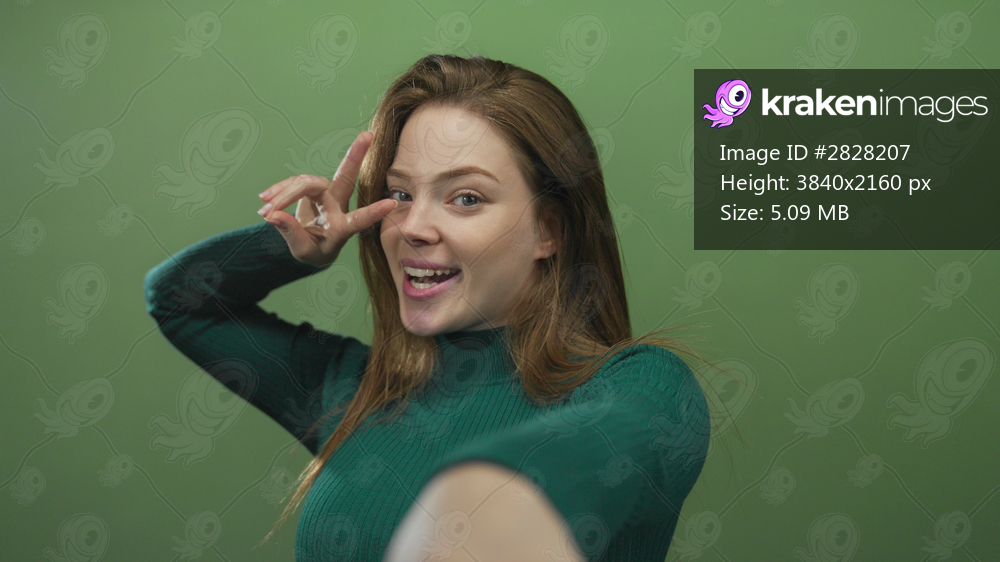 Young caucasian woman pointing finger toward camera in a professional studio setting with confident posture; playfulness joy.