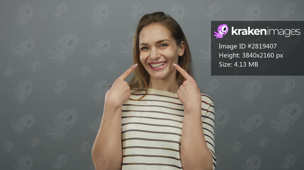 Young caucasian woman pointing fingers to teeth and showing a wide smile in a grey studio; happiness.