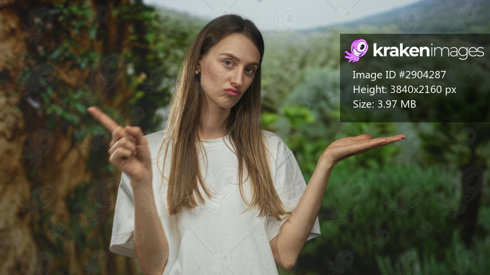 Young caucasian woman pointing index finger and holding palm up in forest setting; contemplation insight.
