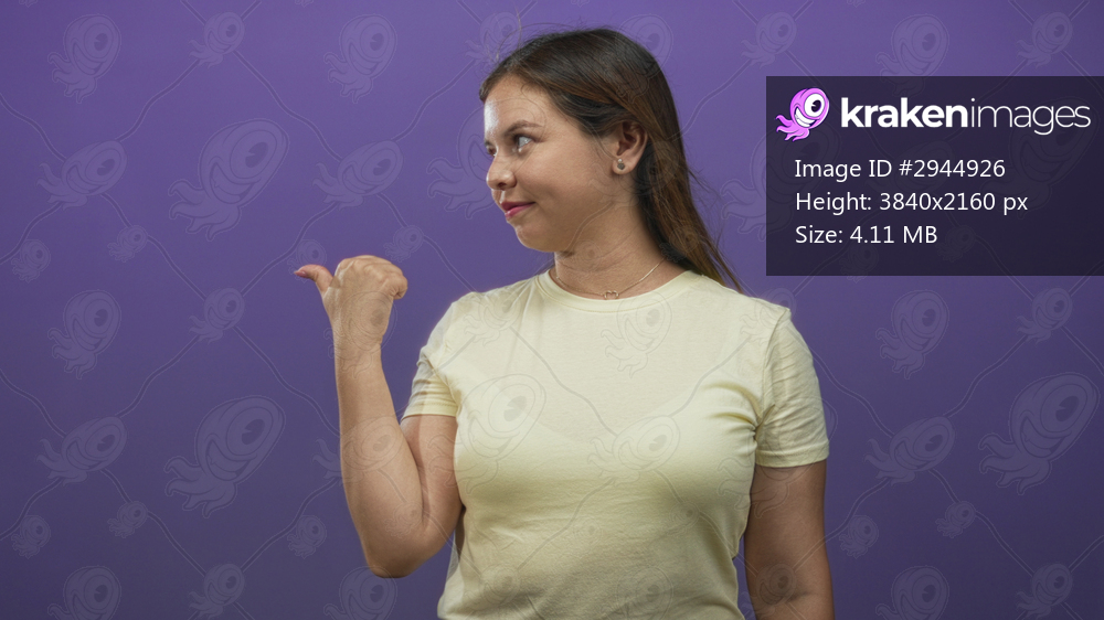 Young caucasian woman pointing thumb over shoulder in purple studio wearing yellow tshirt and necklace; playful attitude.