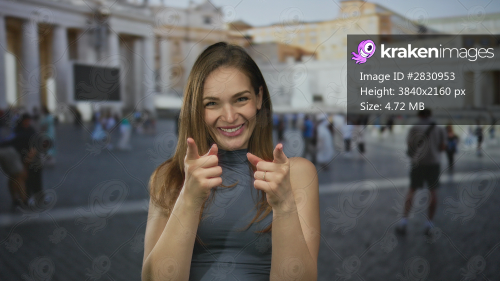 Young caucasian woman points both index fingers to camera on a street at st peters square in the vatican; confidence.