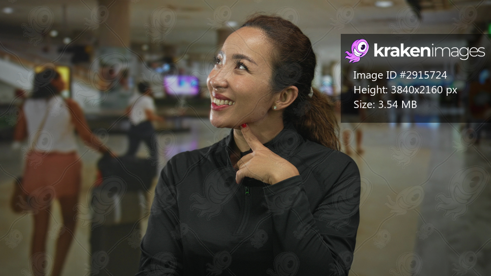 Young caucasian woman with ponytail touching her cheek with a finger in a busy airport terminal, smiling and looking aside; travel anticipation.