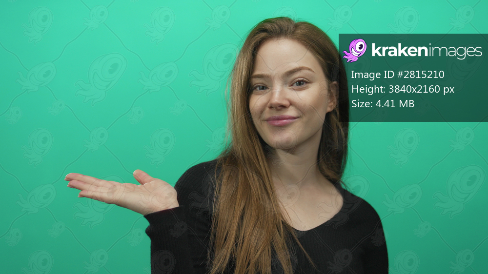 Young caucasian woman presenting palm in studio with slight smile and soft gaze; confidence invitation.