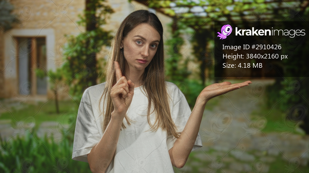 Young caucasian woman with raised index finger and outstretched palm at a building entrance outdoors, neutral white shirt; doubt question.