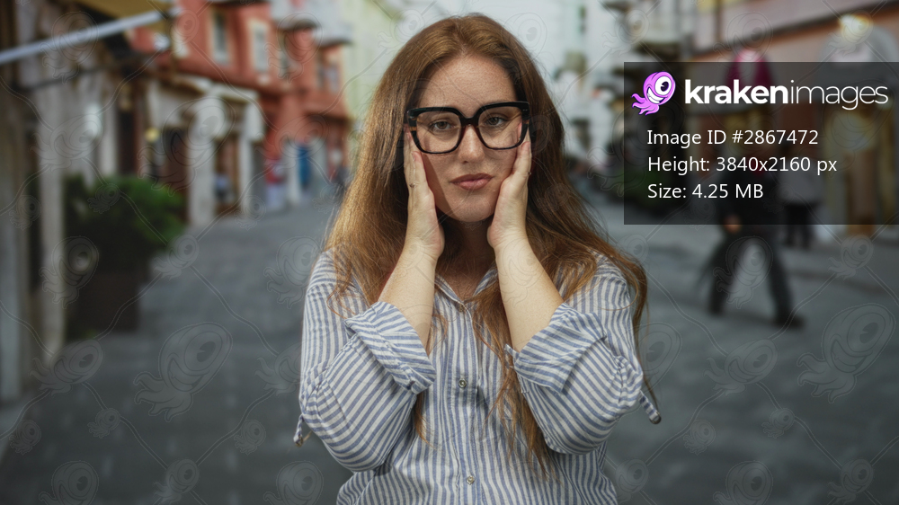 Young caucasian woman with red hair and glasses holds face with both hands on narrow city street amid blurred buildings; stress.