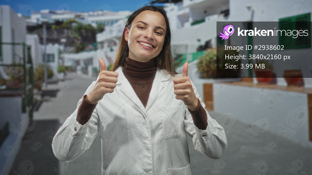 Young caucasian woman scientist giving double thumbs up while smiling and wearing white lab coat on sunlit street with white buildings; confidence.