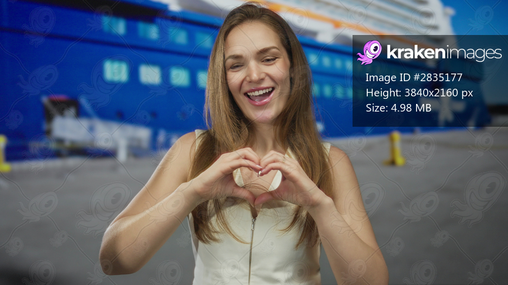 Young caucasian woman shapes heart with hands in front of a large blue cruise ship at port; love romance.