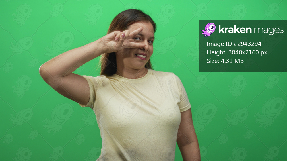 Young caucasian woman showing peace sign with fingers by her eye in green studio set, wearing pale t shirt; playful confidence.