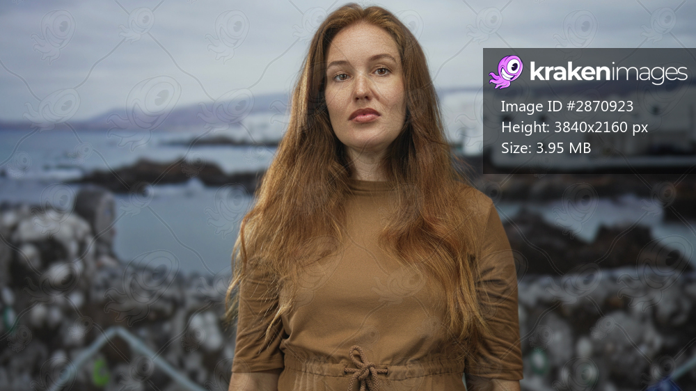 Young caucasian woman shrugs both hands by seaside building overlooking rocky breakwater; uncertainty.