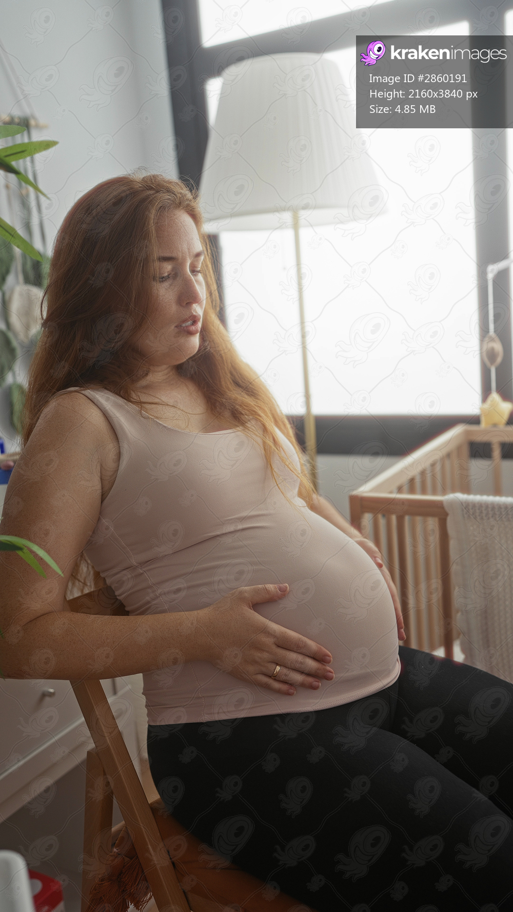 Young caucasian woman sitting on wooden chair holding pregnant belly and grimacing in nursery; discomfort.