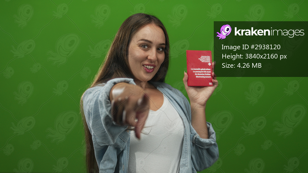 Young caucasian woman smiles, points finger and holds red passport in green studio; travel confidence playful.