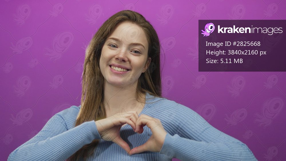 Young caucasian woman smiles while making heart shape with hands in purple studio; love kindness hope joy.