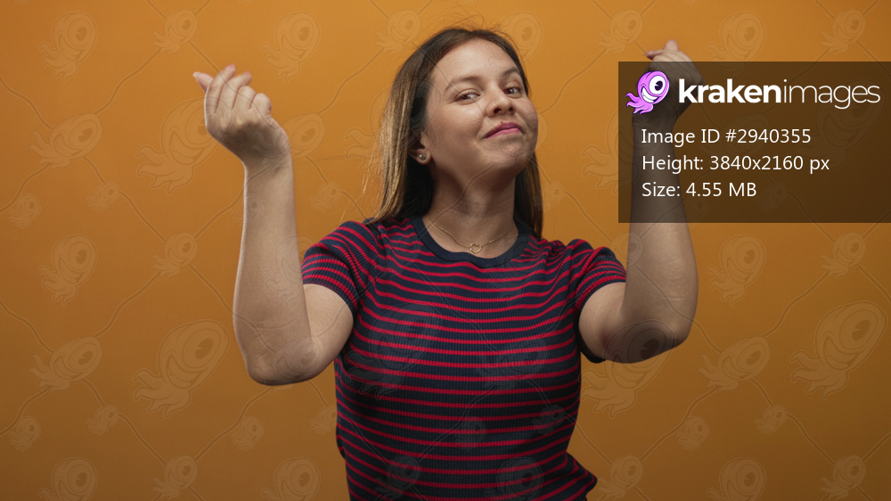 Young caucasian woman smiling and beckoning with both hands in orange studio, wearing striped shirt and delicate necklace; playful invitation.