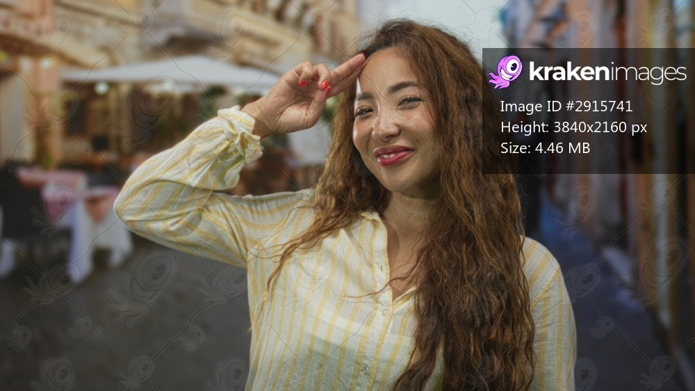 Young caucasian woman smiling with hand raised in a playful salute gesture on a street terrace wearing striped shirt and long wavy hair; happiness.