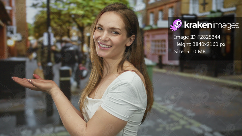 Young caucasian woman smiling holds her hand out on a busy street lined with shops and trees; warm welcome.