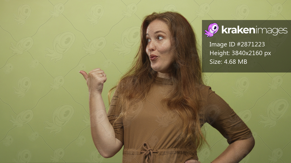 Young caucasian woman smiling and pointing thumb at soft green studio wall while wearing brown dress; confidence.