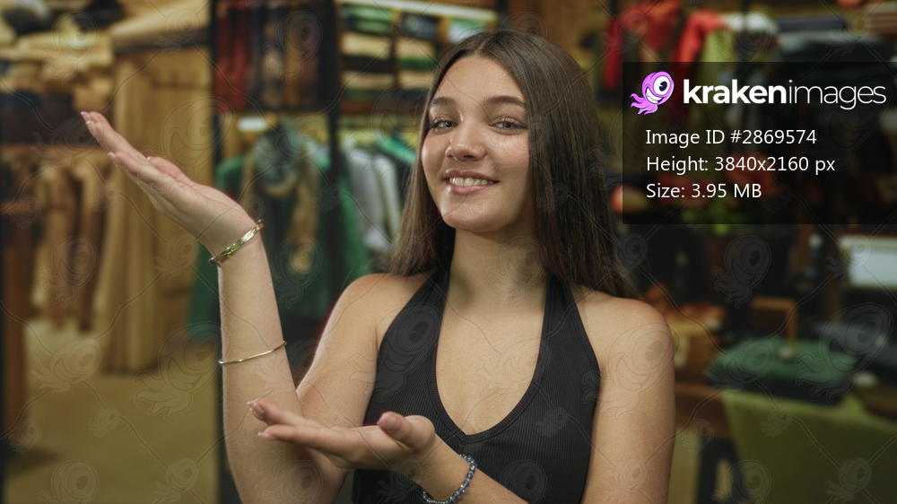 Young caucasian woman smiling and presenting open palms and bracelets in a building clothing shop; optimism.