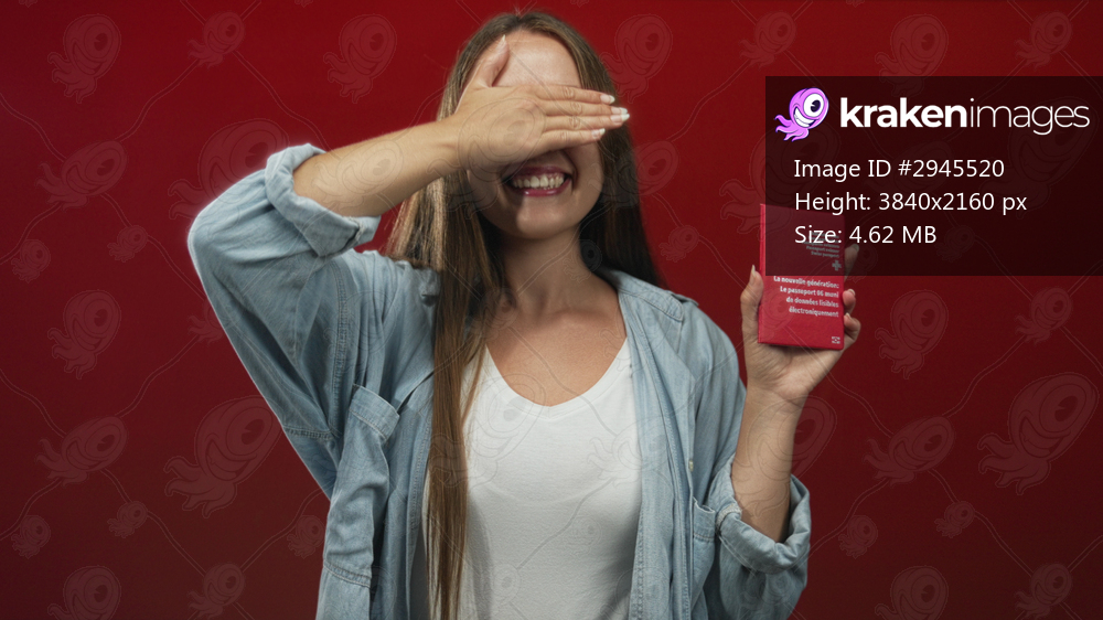 Young caucasian woman smiling while holding a red passport and covering her eyes with one hand in studio with a red backdrop, wearing a denim shirt and white top; travel curiosity playful. - Kraken Images