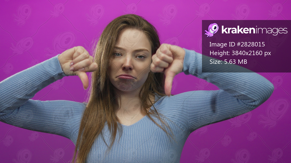 Young caucasian woman with straight long hair and bare thumb pointing down in purple studio wearing blue top; rejection.