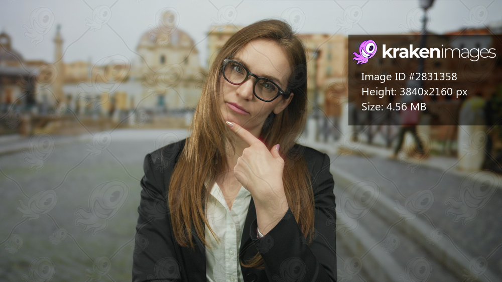Young caucasian woman touches chin in thinking pose at ancient roman ruins building in sunlight; reflection.