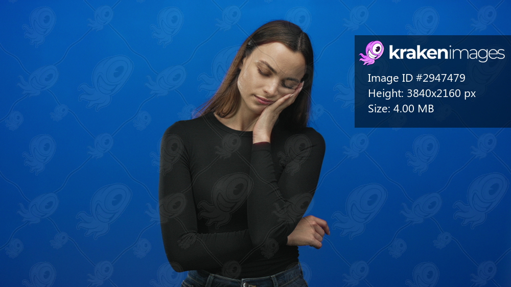 Young caucasian woman touching cheek with hand, eyes closed wearing a black longsleeve shirt and jeans in a blue studio; pensive reflection.