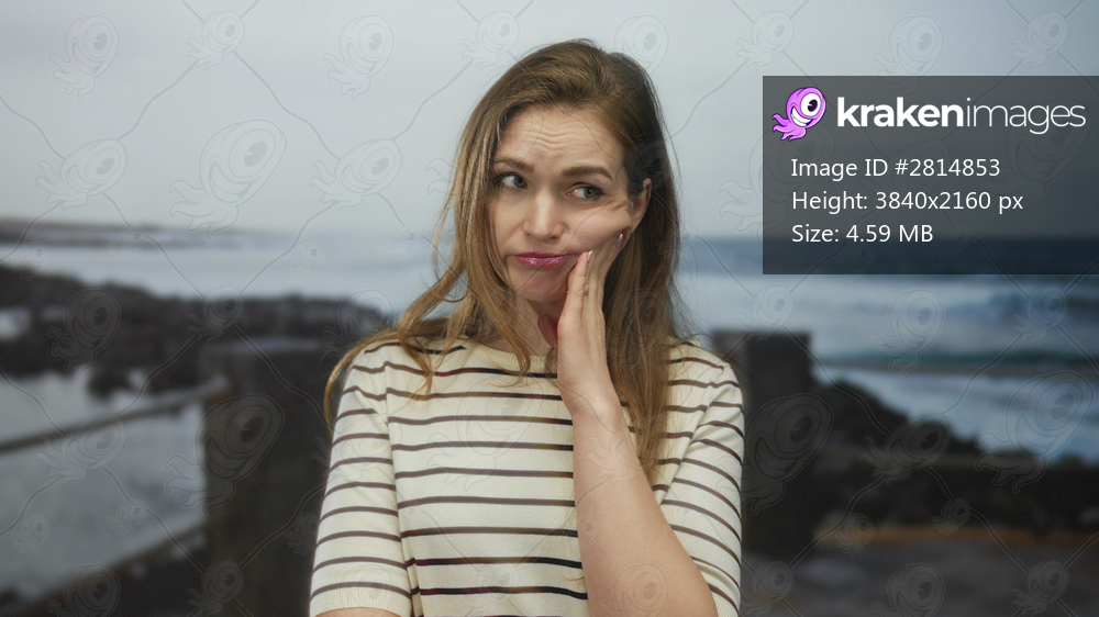 Young caucasian woman touching cheek on quiet street with pained expression and bare cheek visible; toothache pain.